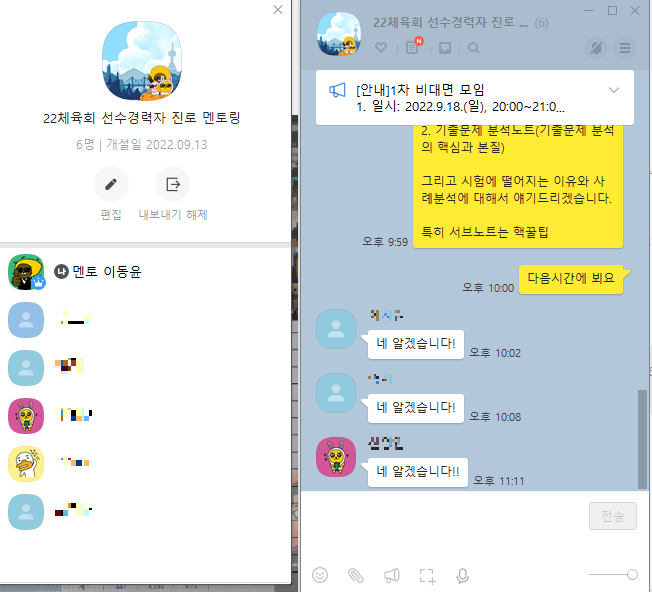 대면모임을 갖기 전에 카카오톡 오픈채팅으로 비대면 모임을 공지했습니다.