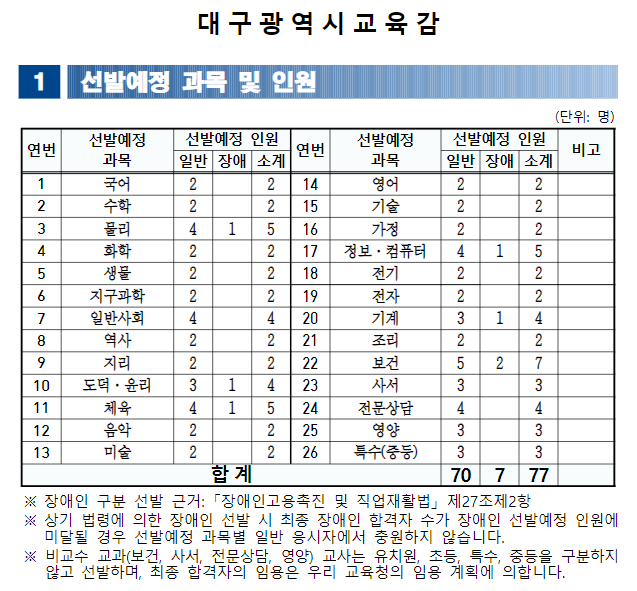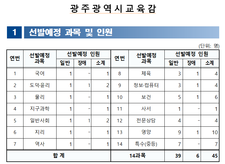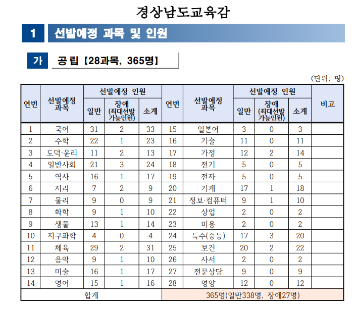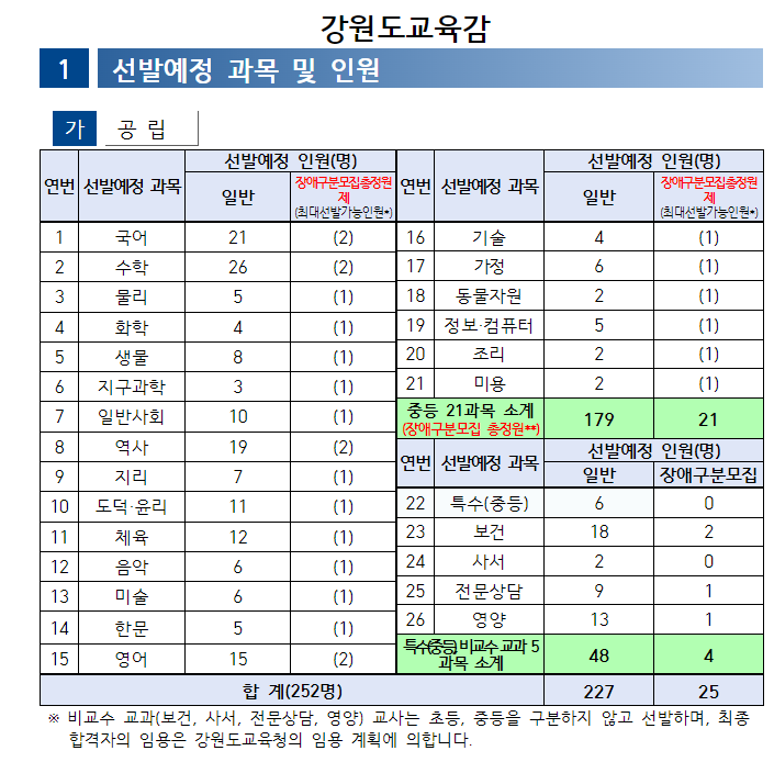 2023학년도 공립(국립·사립) 중등학교교사, 특수(중등)·보건·영양·사서·전문상담교사 임용후보자 선정경쟁시험 시행 계획 공고에서 선발예정 과목 및 인원